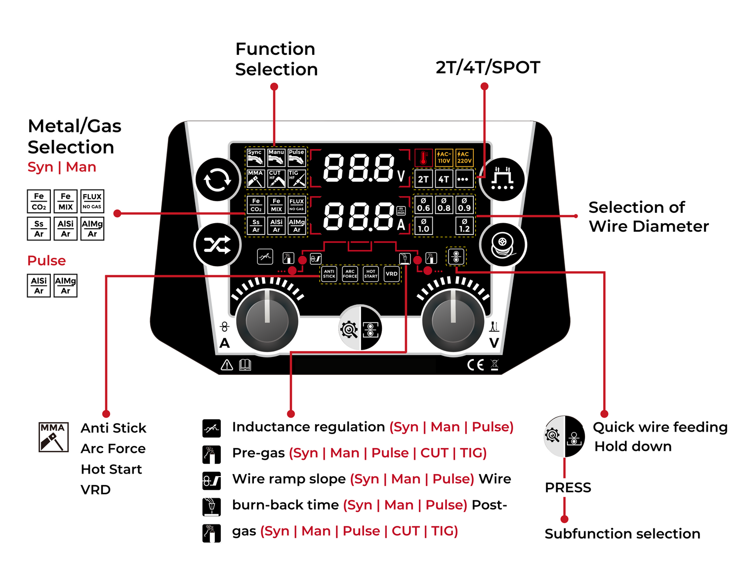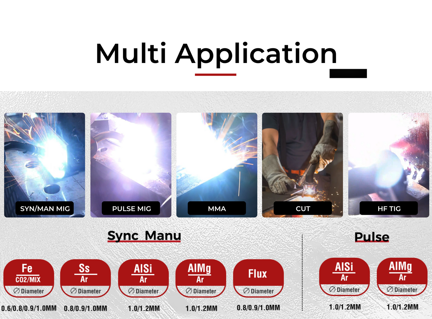 Supports MIG (Synergic & Pulse), MMA, TIG HF & CUT.
